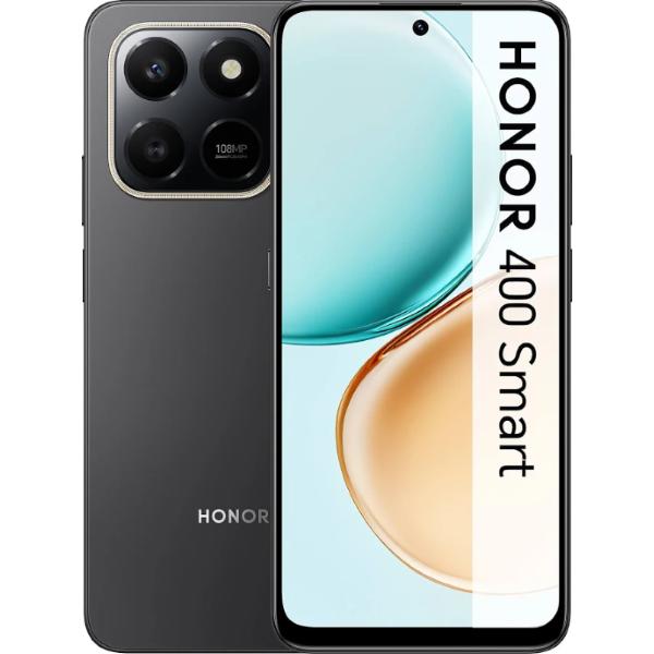 Smartphone HONOR 400 Smart con sistema operativo Android 15 e interfaccia MagicOS, dotato di display TFT/LCD da circa 6,77 pollici con risoluzione HD+ e refresh rate a 120 Hz, doppia fotocamera posteriore con sensore principale da circa 108 MP e secondo sensore di profondita`, fotocamera frontale da circa 8 MP, memoria RAM da 8 GB e memoria interna da 256 GB non espandibile, batteria di grande capacita` da circa 6500 mAh con ricarica rapida (circa 35 W), connettivita` Dual SIM 4G/4.5G, Wi-Fi, Bluetooth e NFC, sensore di impronte digitali laterale, certificazione IP54 per resistenza a polvere e schizzi d’acqua e design moderno in colore Velvet Black.