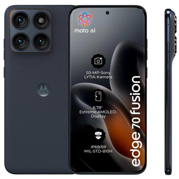 Motorola Moto Edge 70 Fusion 5G con display AMOLED da 6.78 pollici risoluzione 2772x1272 e refresh fino a 144Hz. Equipaggiato con processore Qualcomm Snapdragon 7s Gen 3, 8GB RAM e 256GB storage. Fotocamera principale da 50MP con sensore Sony LYTIA e frontale da 32MP. Batteria circa 5100-5200 mAh con ricarica rapida, certificazione IP68 e Android.