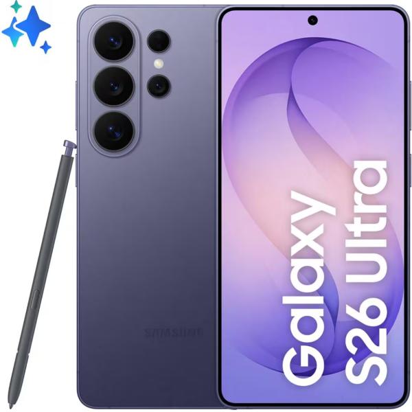 Samsung Galaxy S26 Ultra Smartphone AI, 256GB, Privacy Display integrato, Processore potente, Assistente Foto, Camera 200 MP, 5000 mAh, Cobalt Violet. Dimensioni diagonale schermo: 17,5 cm (6.9"), Risoluzione del display: 3120 x 1440 Pixel. Famiglia processore: Snapdragon, Modello del processore: 8 Elite Gen 5. Capacità della RAM: 12 GB, Capacità memoria interna: 256 GB. Risoluzione fotocamera posteriore (numerico): 200 MP, Tipo di fotocamera posteriore: Telecamera per quad. Capacità della scheda SIM: Doppia SIM. Sistema operativo incluso: Android 16.0. Capacità della batteria: 5000 mAh. Colore del prodotto: Viola. Peso: 214 g