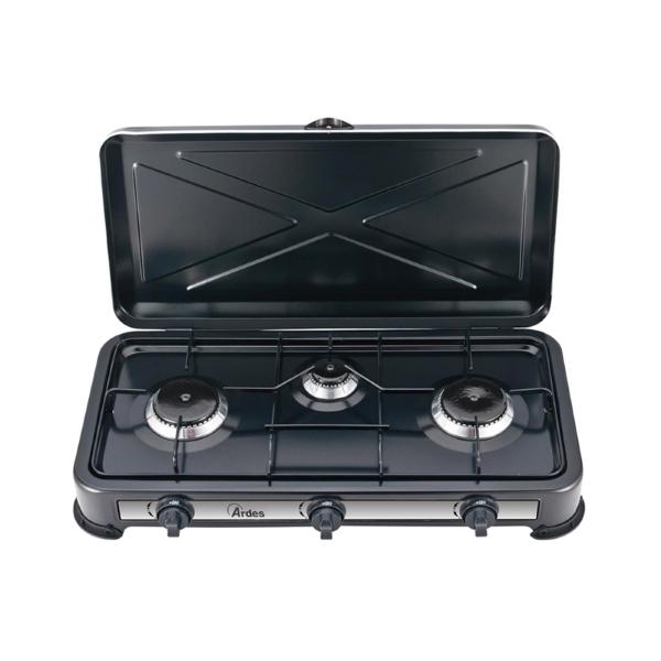 ARDES | AR1FG03 Fornello a Gas da Esterno GPL Cucina a Gas Portatile per Campeggio 3 Fuochi Con Coperchio In Acciaio Verniciato Nero - Classe di efficienza energetica A+++