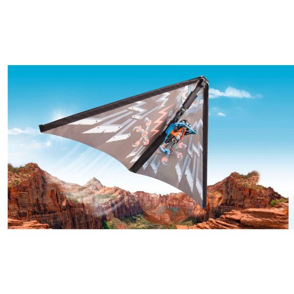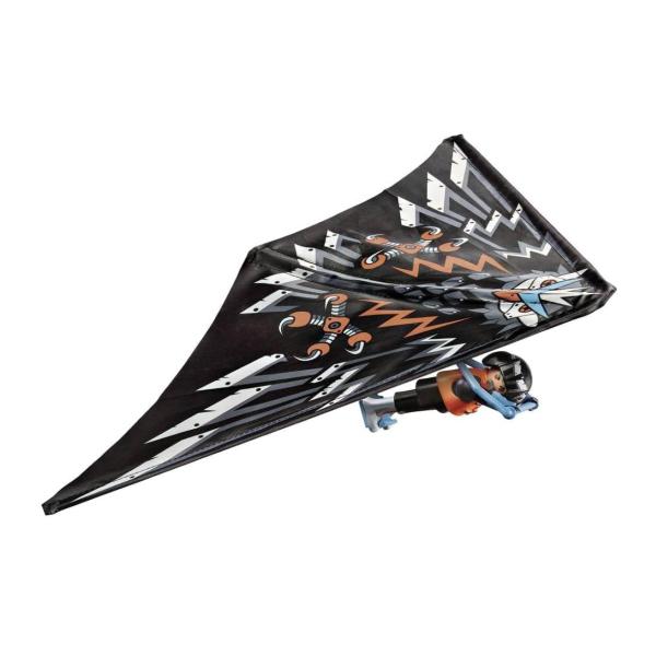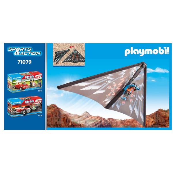 1 stuntman con casco removibile, 1 deltaplano playmobil con vela in tessuto ripiegabile e con supporto fissabile per agganciare i piedi di un personaggio adulto