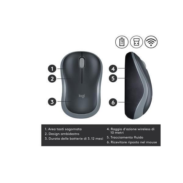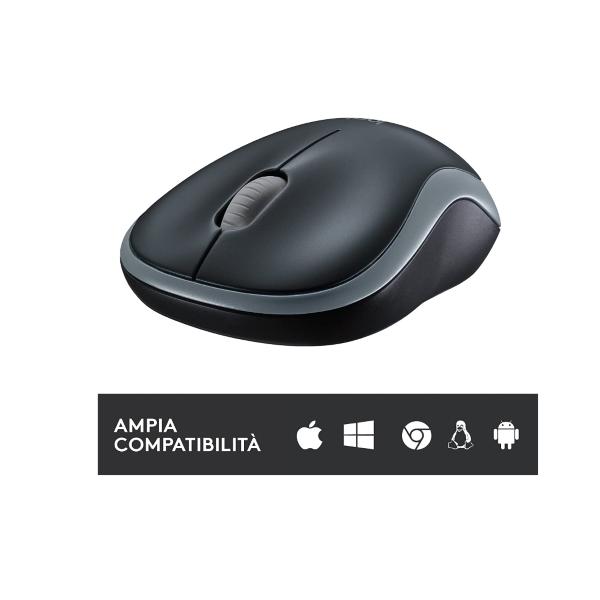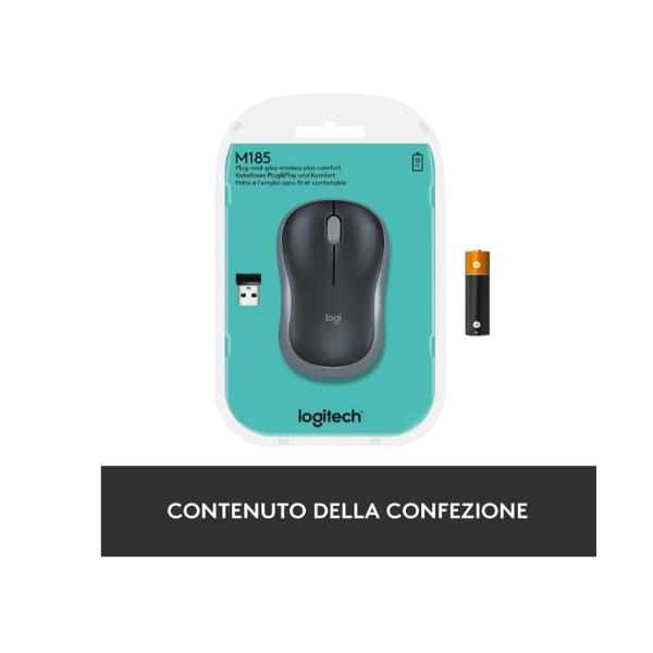 Logitech Wireless Mouse M185. Tecnologia di rilevamento del movimento: Ottico, Interfaccia dispositivo: RF Wireless, Numero di tasti: 2. Alimentazione: Batterie. Colore del prodotto: Grigio