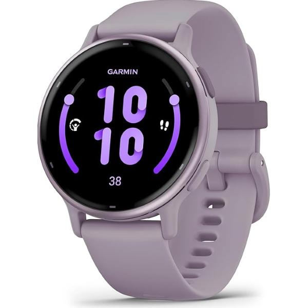 Smartwatch sportivo Garmin Vivoactive 5 con cassa da 42 mm progettato per il monitoraggio completo di salute e attività fisica. Dotato di display AMOLED touchscreen da 1.2 pollici con risoluzione 390x390 pixel, integra GPS, WiFi, Bluetooth e supporto ANT+. Offre oltre 30 profili sportivi tra cui corsa, ciclismo, nuoto e camminata. Include sensori per frequenza cardiaca, ossigeno nel sangue, monitoraggio del sonno, stress, contapassi e calorie. Memoria interna da 4 GB e funzioni smart come notifiche, pagamenti contactless e controllo della musica. Resistente all acqua fino a 5 ATM e con autonomia della batteria fino a 11 giorni in modalita smartwatch. Cassa in alluminio e polimero con cinturino in silicone viola regolabile. Compatibile con dispositivi Android e iOS. Colore: Metallic orchid
