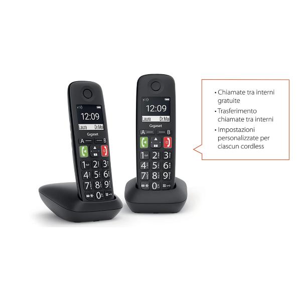 Gigaset E290 Duo. Tipo: Telefono analogico/DECT, Tipo di apparecchio: Cornetta wireless. Telefono con vivavoce. Raggio d'azione interno: 50 m, Raggio d'azione esterno: 300 m. Capacità rubrica: 150 voci. Identificatore di chiamata. Dimensioni schermo: 5,08 cm (2"). Colore del prodotto: Nero. Numero di cornette incluse: 2