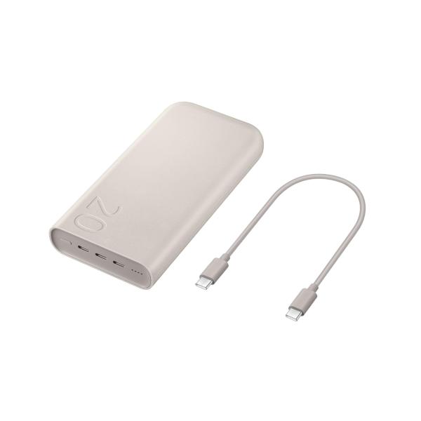 Power bank Samsung ad alta capacità da 20000 mAh con ricarica super veloce fino a 45W, compatibile con dispositivi Samsung e universali. Dotato di tre porte USB Type C per la ricarica simultanea di più dispositivi e supporto Power Delivery 3.0. Design compatto in colore beige, ideale per smartphone, tablet e laptop in mobilità.